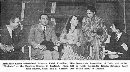 Filmindia continued to support this view in every following issue. In the middle of the year Baburao embarked on a world tour via ship, and met with Alexander Korda in London after travelling through Italy, Hungary and Germany and examining their film industries; he left Germany just as World War II was declared! Korda had produced and directed a film called The Drum in 1938 which also portrayed Indians in a bad light, and Baburao did his best to convince him to do better.