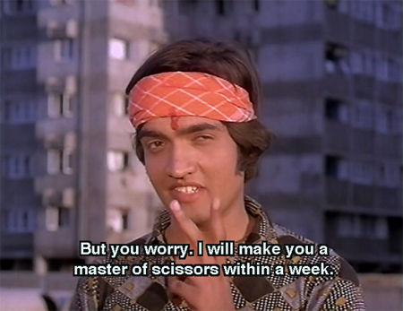 They are a seriously disgusting bunch. Tony (Shakti Kapoor in his debut but still incredibly creepy to me and not in a good way), Sony (? the most benign one), lice-ridden Rana (Phansok, a skinny Danny Denzongpa wannabe) and paan-stained Rahim (Mehmood Jr with truly the largest hair I have ever seen on anyone, including Sly Stone), are punks who terrorize the local neighborhood.