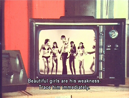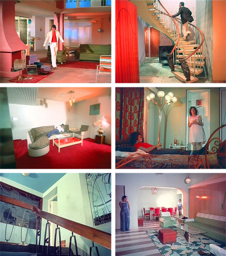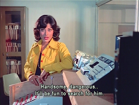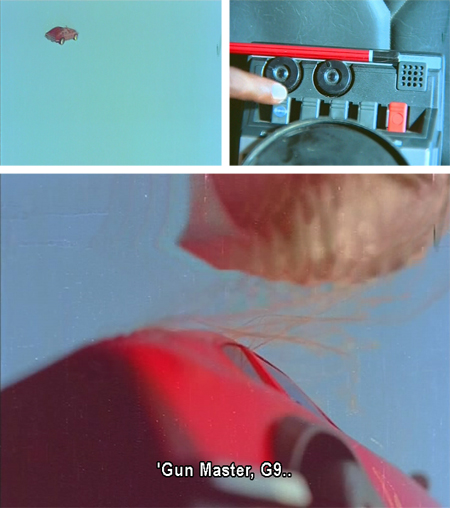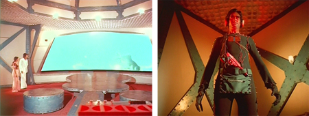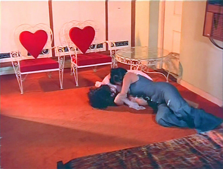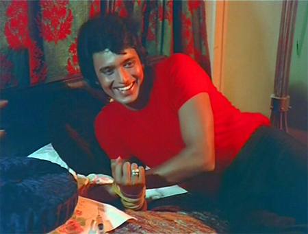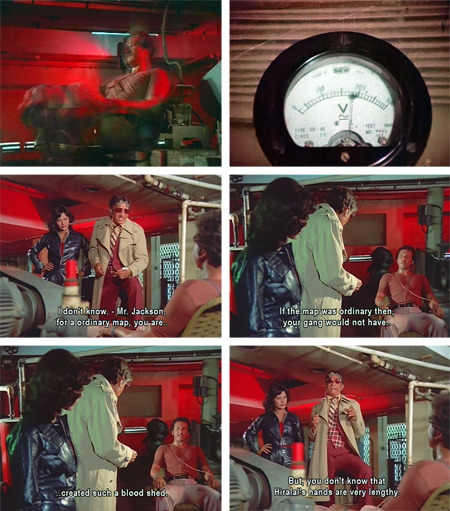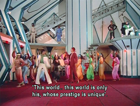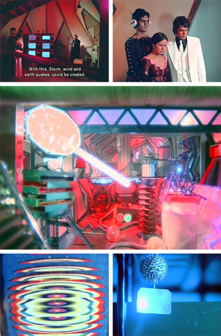The beauty of Surakksha lies in the triumph of imagination over economics. I pretty much have to love and respect a filmmaker who spends most of his spy-movie budget on wallpaper and furnishings. This lacks the yellow plastic locusts of its sequel Wardat, sadly, but compensates by making said locusts appear positively high-tech in comparison to what GMG-9 encounters here. And the cinematography, courtesy of director-producer Nagaich in a triple threat, is really interesting. Crazy angles, migraine-inducing lighting…it’s all there. This writeup is even more screenshot-heavy than usual, due to the spectacular visuals which have to be seen to be believed. No real attempt to link plot points together is made: the story consists mostly of random (stolen from Bond) events which serve as an excuse for plenty of action and accessories which are a cracktastic tribute to the Indian spirit of jugaad.