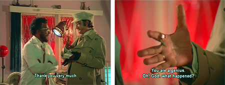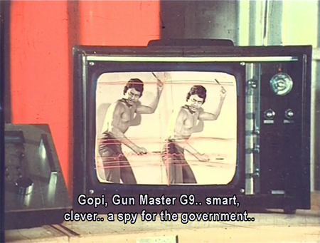 Elsewhere, Hiralal is instructed by his mysterious boss (who sports a blue glove with a remote control glued onto it) to track down GMG-9 as well. They communicate via a complex system made up of what looks like an old manual typewriter, a postage meter, and a television set.
