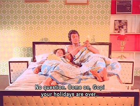 Iftekhar locates him first: Gopi is in bed with a pretty girl, whom he renders unconscious by means of a sleeping-gas filled cigarette lighter and then uses as a telephone stand.