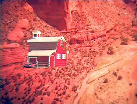 It is clearly some sort of collage with paper cutouts of a toy barn and a car glued onto a photograph of a canyon. Much of the footage in this film consists of toys being flung about to simulate cars flying through the air, etc. Gopi is forced to drive off a cliff during one chase scene (his pursuers hilariously wear helmets possibly borrowed from Dharmendra in Saazish), but luckily his high-tech car has a parachute.
