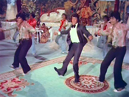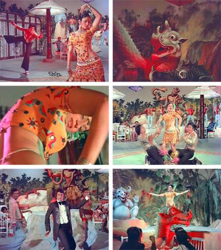 The Forest Klub interior is anything but house-cat friendly (gargoyles! dragons! a limping waitress whose shoes are too small or something!) but GMG-9 makes himself at home at a table occupied by Priya (Ranjeeta Kaur) and her friend Kamla. As feared, the ensuing song is abysmal. I am relieved to see Aruna Irani, who actually can dance and does so around a pelvic-thrusting Mithun. And to be fair, Mithun does bust out some moves at one point which makes me wonder what he might have done with Dick Van Dyke and “Me Old Bamboo” from Chitty Chitty Bang Bang.