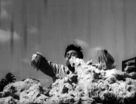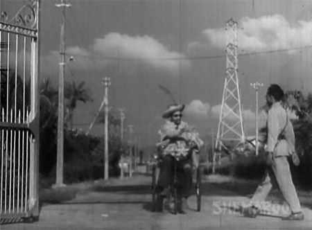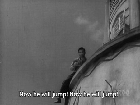 Anyway, in his depression Funtoosh wanders in front of an automobile which nearly hits him. The driver, Karodilal (KN Singh) yells at him and drives away. The next day, Funtoosh climbs up onto a ledge at the top of a building and attracts an enthusiastic if bloodthirsty (and in some cases entrepreneurial, selling a look through a telescope for 1 anna) crowd.