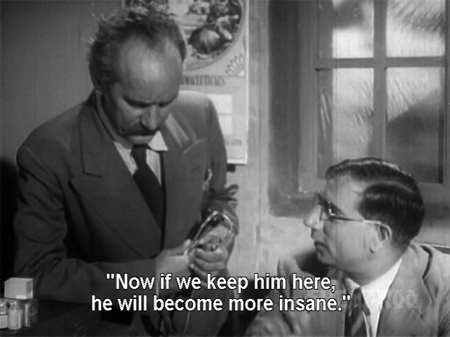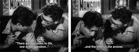 The next day Karodilal drives Funtoosh to the railroad tracks, talking animatedly the whole way about what a great person Funtoosh has been but how everyone has to die someday, and repeating the poor guy’s promise to kill himself after a week of living it up at Karodilal’s expense. It’s very surreal, as I am sure it’s meant to be. He persuades Funtoosh to place his head on the track in front of an oncoming train, and Funtoosh complies unwillingly—only to have the train switch tracks at the last minute and miss him. Shaken, he asks Karodilal to grant him a little extra time and they haggle it out.