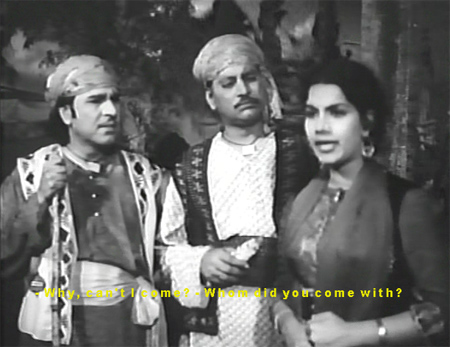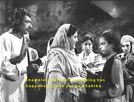 Umara the matchmaker now becomes very busy, going first to fix Sahiba’s marriage with the son of Choudhary Sahab (Nazir Kashmiri—how it thrills me to say that!), and then to Mirza’s parents’ house, where he tells them how mistreated Mirza has been. Mirza’s mother asks him to plead with Mirza to return home—which he doesn’t have to do because Bibo (?) is already suggesting it to Mirza.