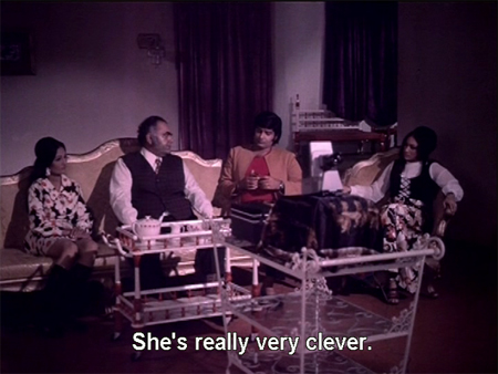 I don’t know whether to laugh or cry, especially when Anil still doesn’t get it, asking if the object of her lust is a Ministerial position or something. Eventually Natwarlal gets the point across, and we meet Kamini and her necklace at a party in this fabulous room which I’ve seen before. Does anyone know if it was an actual place? Or just a set? Very distinctive decor, in any case!