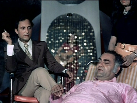 But I will soon discover that Usha Khanna’s music is by far the best thing about this sleazy trainwreck of a film. The track above is a fitting introduction to Mr. Natwarlal (Pinchoo Kapoor), a criminal with a den populated by ladies playing musical instruments behind a series of glittering curtains.