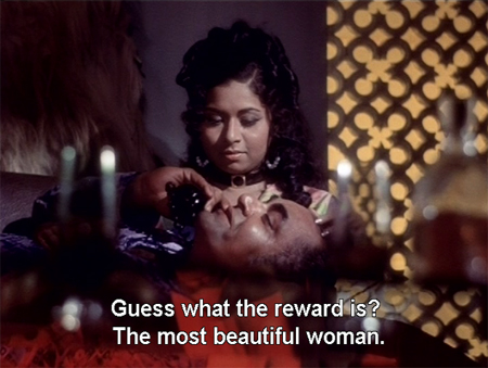 It’s a showcase of sorts for Bindu, but I have to wonder at the pressures or motivations that made her do this film. I can’t even imagine what she might have thought and felt while making it: she is objectified, vilified, and exploited. The men behind the scenes making sure that no view of her physical assets is left unexplored clearly intend for the audience to buy into their fantasy of an indiscriminately and sexually voracious woman. Without exception the male targets of her lust are portrayed as helpless victims: she and she alone must be punished for her desires. The refusal to take responsibility for what is really no more than the filmmaker’s own prurient desires and the implicit judgment of the woman “at fault” infuriates me.