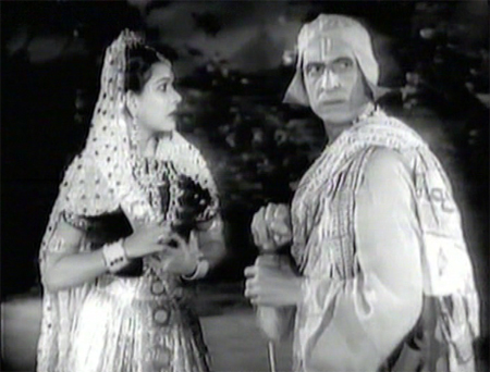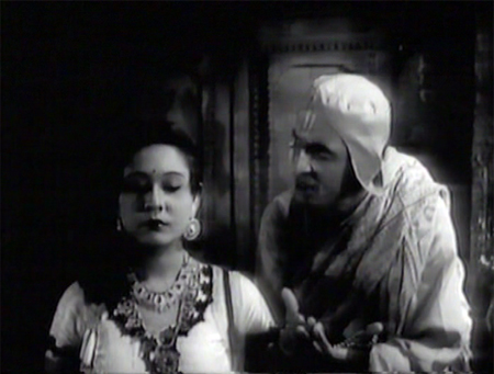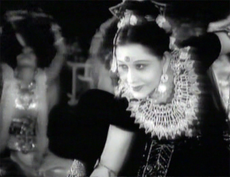 Sadhona is unbelievably graceful. I would love to see her in something else (1937’s Alibaba for instance! Make it happen, universe!). King Jaisingh (Nyampalli) arrives just as the dance ends to chastise Chandra for not going to meet the High Priest. But Koshishwar (Jal Khambata) is already there in the midst of the priests, and praises Indrani’s performance as Radha to the skies. He approaches her to apply the Sacred Dust and is stopped by the horrified King, who informs Koshishwar that she is a mere dancer.