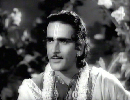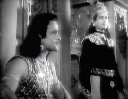 We begin in the Court Dancer’s little garden, where everyone has gathered to celebrate Janmashtami. Prince Chandrakirti (Prithviraj) appears to visit his ladylove Indrani. He is to be crowned King by his father in another month and he is determined to marry Indrani, although his father frowns upon the liaison. Their meeting is interrupted by the Captain of the Guards (Thapan).
