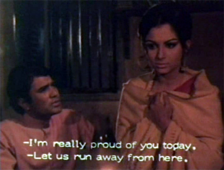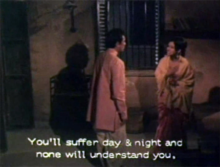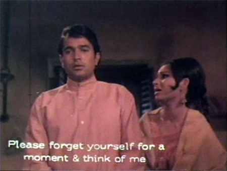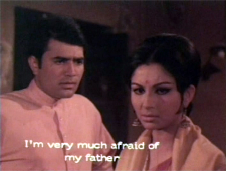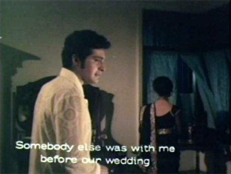 Incidentally, on the issue of Sharmila and her confessions to her husband, the bad subs are to blame for how you perceived it. She told him about her prior relationship because he teased and badgered her about it thinking he was being cute. She was his prize, this beautiful woman, he’d won her but he was thrilled to think that there may have been others coveting her beauty. Unreasonably, however, though he said he was broad-minded and wanted her to tell him the truth if she’d had any previous relationship, given ye olde screwed-up Indian male mindsets, he probably thought that she had been much admired but that in true ‘sati savitri’ Indian woman fashion had been too chaste to reciprocate! And he really did keep on at her about “I can’t abide lies, please let me know the truth, truth is the foundation of a good marriage, blah blah” and despite her obvious discomfort during that scene, she takes him at his word, says it like it is and voila, the denouement as you have it! I want to point out though that when the subs have her claiming, “Somebody else was with me before our wedding”, she did not mean in the Biblical sense. Rajesh was too high-minded for that wouldn’t you know :-) though her husband obviously thought otherwise.
