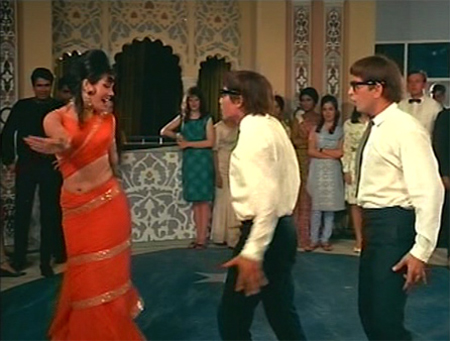 One category of title music is the dreaded earworm: a tune with the film’s title repeated endlessly and from which you cannot free yourself for days after hearing it. It does help you retain the name of the movie, but that isn’t necessarily a good thing! I am talking of course about things like “Crook crook crook crook crook crook (internaaaa-tional choooooor)” and “Proooooo-feeeeee-ssor PYARE-lal“. Of course I am partial to “Mem Saab!” from the rather dull film by the same name, and this one from Shammi’s Bluffmaster (“Oh bluff! Oh bluff bluff bluff! Maaaaaster!”):