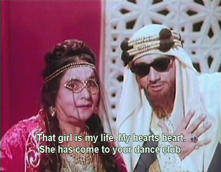 Hackneyed fairy-tale featuring a lost prince returning home? Check. Shrill Saira Banu opposite preternaturally youthful Dev Anand? Check. Portly Premnath as an evil Senapati? Check again. Did I like the film? Oh hell yes! What’s not to love about a movie that advertises a cast of “about 500 Indian & International junior Artistes” and delivers on that promise? Who cares if the plot is silly? Not I, given a frothy sixties travelogue with ports of call in a Middle East populated by blonde belly dancers and stoned hippie extras. I love to see my people in Hindi movies. Plus, Shankar Jaikishan provide some seriously catchy tunes to accompany all the onscreen antics.