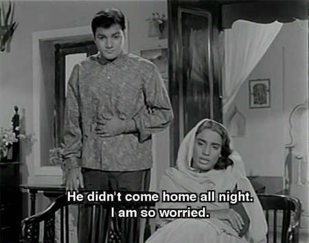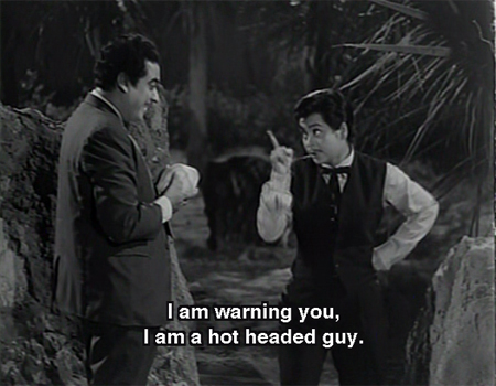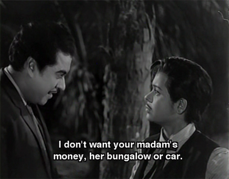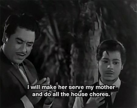 Posing (may I say unusually convincingly as well—Kum Kum changes her tone of voice and her body language in a way most actors disguised as the opposite gender don’t bother with) as her own servant “Pinto,” she runs into Deepak outside, who cultivates a friendship with her in order to meet “Madam”. As he waxes rhetorically about his adoration of her, Sangeeta is touched by his obvious devotion: