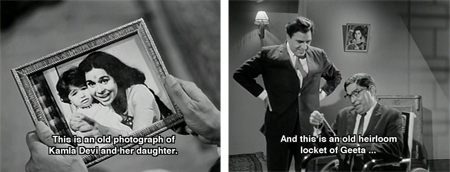 Meanwhile, Kamla Devi—now old and gray—is still looking for her Geeta, and she hires a detective by the name of Sokhanlal (IS Johar) and his sidekick Makhanlal (Majnu?) to find her. IS Johar always makes me giggle, even when his antics are stupid. Kamla gives him the same photograph of herself and Geeta which Bihari has, and tells him further that Geeta has a birthmark on her back (Sokhanlal turns the picture over to look).