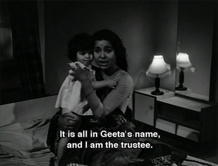 Banwarilal now takes what seems to me an unnecessarily convoluted approach to getting his hands on Mohandas’ wealth, and kidnaps little Geeta after shooting Mohandas dead, leaving poor Kamla Devi devastated. She is told the next day by the police that both Banwarilal and Geeta seem to have died in a car accident: they have retrieved Banwarilal’s car from the sea, although they have found no bodies. She sensibly refuses to give up (unlike the police) and vows to find her daughter.