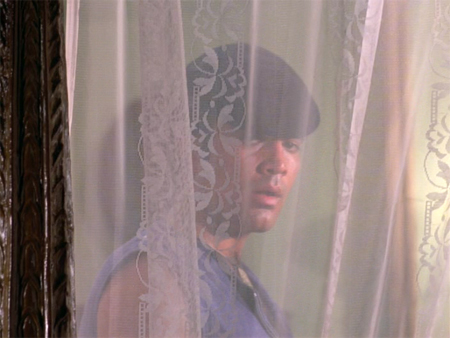 This is so so cute—he touches her face and as she turns in her sleep (although how she can sleep on those sheets befuddles me) he murmurs “You are something special.” Melt, melt, melt! He steals all her jewelry, but leaves a nice note in lipstick on her mirror.
