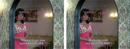 When one of her customers, Govardhan Das (Raj Mehra), becomes a little too forward for her liking Raja rescues her and throws Govardhan out. They flirt a little and he chastises her gently for her profession—but she tells him she has to survive. Police sirens come closer and he takes his leave—and Rani covers for him when they come looking for Raja.