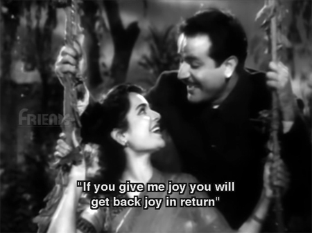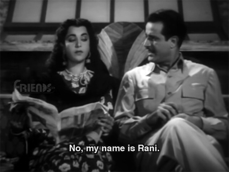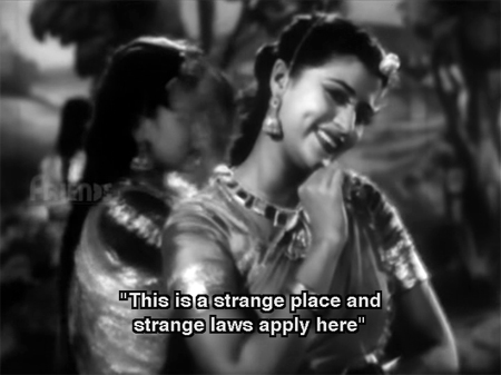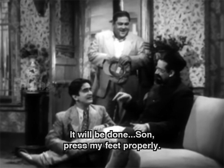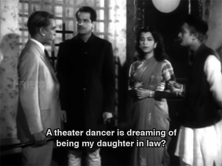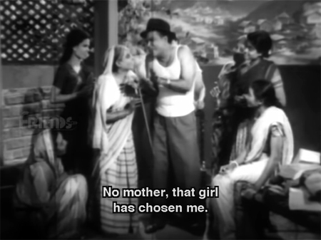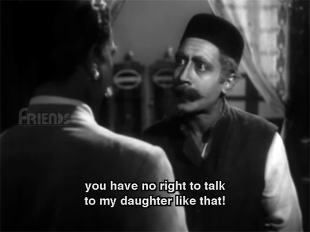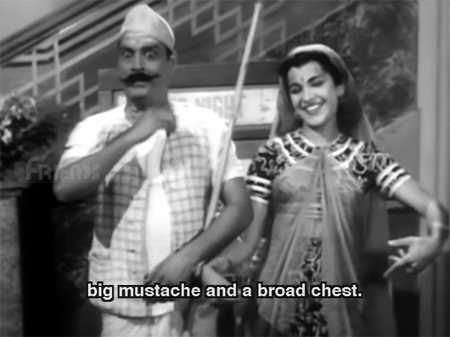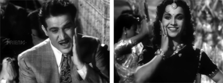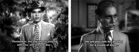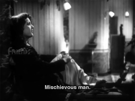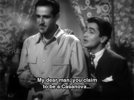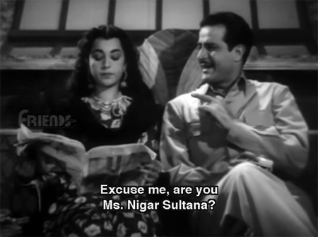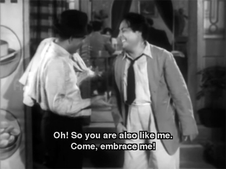 We are treated to some of the troupe’s performances, most notably the aforementioned “Mere Piya Gaye Rangoon”—a song which is just too fabulous to be missed. Gope completely cracks me up, and C Ramchandra and Shamshad Begum’s vocals are perfect for the picturization on Gope and Nigar Sultana too. And I have to give props to fIENDS again (I know! It’s killing me!!!) for subtitling the songs in this, the lyrics are just so witty too.