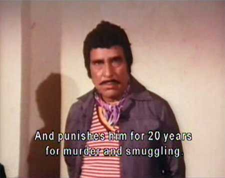He plays Hiralal, leader of a gang of smugglers, whose nefarious activities are observed one night by two fisherwomen walking home. They manage to escape and give a description to Police Inspector Mehmood (Krishan Dhawan) the next day before Hiralal tracks them down again. The one who had put up a fight the night before does so again after giving her baby daughter to her friend and telling them to flee. Alas—she is killed, but her valiant self-defense keeps Hiralal busy long enough for Customs Agent Harnam Prasad (Ajit) to arrest him. Hiralal is found guilty thanks to Harnam Prasad’s testimony and sent to the Big House.