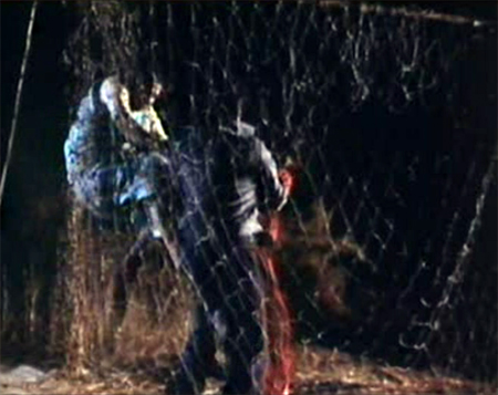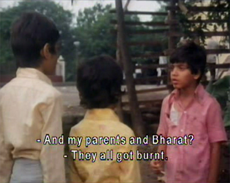 The Prasad family is torn apart when Hiralal’s men tamper with the brakes on Ram and Laxman’s school bus during an outing—Ram tries valiantly to stop the bus containing his brother, but it rolls over a cliff taking both boys with it and bursting into flame. Harnam Prasad has taken the youngest, Bharat, on a boat ride; Shera, having hidden himself on it, stabs Prasad in the back and jumps overboard. Poor little Bharat covers his eyes as his father collapses and the boat collides spectacularly with the rocks on shore, bursting into flame.