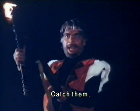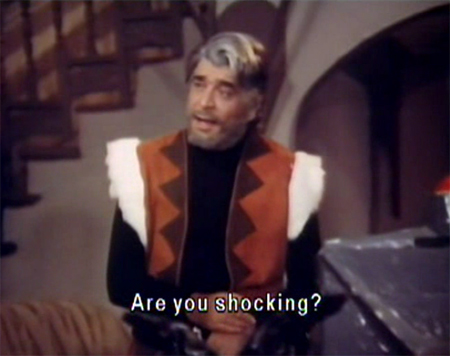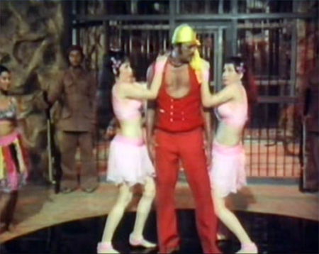 I am thrilled when the proceedings now move to an underground rocky lair with lots of cages—and scantily clad dancers writhing around an uncomfortable looking guy as “The Hustle” plays in the background (the original). It’s hilariously bad.