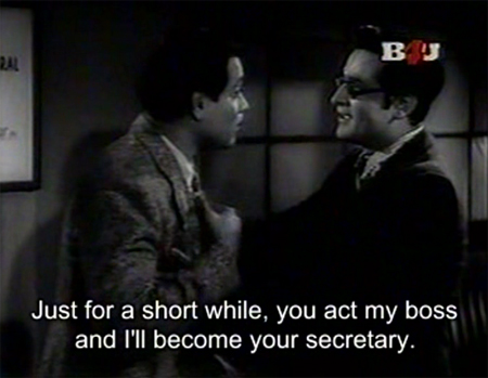 Manohar agrees and for his part uses his new “position” to extract some benefits for the proletariat in the office, to Moti’s dismay. He gives everyone a pay raise, and contributes 10,000 Rs from the company to a charity show which Meenu is putting on. The charity show gives us another lovely song, “Tik Tik Tik Bole O Bole” (I really like the songs in this film: Sajjad Hussain wrote a couple of them, with the majority by Bulo C Rani).