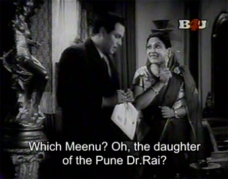 Manohar goes to meet Meenu and Moti backstage, where Meenu tells him that Moti hasn’t shown up; he offers to drive her to Moti’s house. But when they get there they see Moti trying to comfort his old friend Chandni and completely misinterpret the scene.