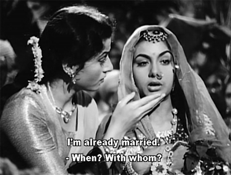Probably most of my favorite scenes are the ones with her AND Madhubala—they are lovely together…I particularly love the scene where she teases Madhubala about finding the ring, not realizing that she is hurting her by doing so.