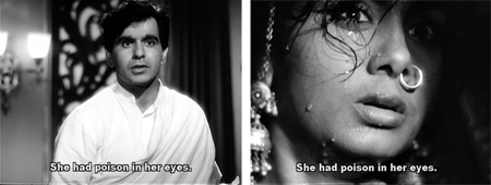 Madhubala and Dilip Kumar were in the midst of their affair, and it shows in their sparkling chemistry (which is actually part of the problem for this instead of a blessing), and Nimmi is wonderful as the simple but irrepressible milkmaid Sonia who finds herself in an untenable situation not of her making. Her theatrics are more, well, theatrical than the understated performances of her co-stars, but it’s impossible not to love her.