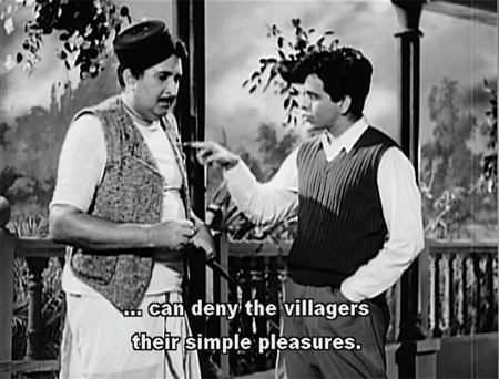 That girl is Anju (Madhubala), the daughter of the local (to Amar and the village) zamindar, Rai Sahab (Ulhas). The angry villagers (led by the CSP, Mukri, a villager who has become a lawyer himself albeit a cowardly and ineffective one) go to the zamindar to ask for justice and that their fair be allowed to take place on Sankat’s land as it always has. Rai Sahab does not care about their problems, but Anju intervenes when her father will not.