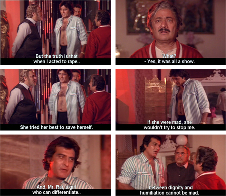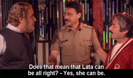 An interesting point you bring up in this movie is how Lata reacts because Arjun is her husband. It irritates the hell out of me when a wife suddenly goes into “mera pati mera devta hai” (my husband is my lord) mode, when the said hubby has not reciprocated with any respect whatsoever. It has happened in plenty of movies – and is probably the biggest requirement in movies for a “bharatiya naari”. Perhaps this is the single biggest reason I just loved Shabana in Arth. One of the best movies of the decade. Not that it had much competition. :-)