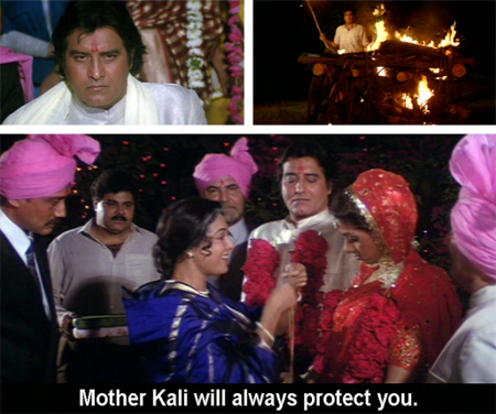 Arjun marries (still crazy) Lata, and pushes her off the cliff that her sister jumped from. Karan investigates her “suicide” and cleverly deduces from the giant Arjun-sized shoe-prints and cigarette butts left on the scene that Arjun killed her. Lata doesn’t die though, and is rescued by some fisher women—but the knock on her head from the fall has restored her memory and her sanity (this last is debatable to me, but that’s the general assumption). She doesn’t appear to remember that Arjun pushed her off the cliff though, and she acts as lovingly towards him as a good wife should. Arjun seizes an opportunity to take her to a Kali Maa puja, where he plans to kill her at the temple. On the way they pass the place where his sister had died, and Lata remembers the accident. She makes him stop the car and asks the vendor there if the girl survived; he tells her no, and that the girl’s brother went mad with grief.