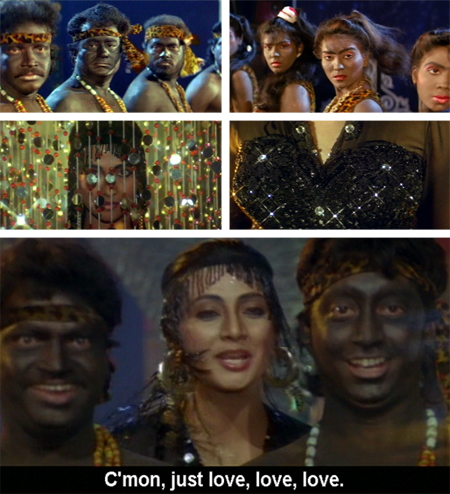 He’s going to need it, too. As Moon Moon Sen gyrates with backup dancers in black/green face in a bar: