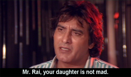 In all this, I completely forgot the comment I meant to write before your post sucked me in but this reminds me – I think this is a remake of sorts of a Rakhee movie in which she plays this insane heiress who is married by a stranger played by Vijay Arora (with many a side glance and squinty look) whose evil plan is to kill her once they’re alone together so he can have all her money. I don’t remember if he does it straight up for the money or if he has Deep Secrets Buried in His Manly Bosom a la Vinod here.