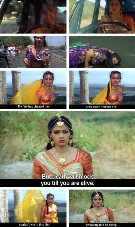 I do remember that at some point she turns to him and says, “I know you want to kill me and it’s ok because you’re my husband” the same way Sri does. Hindi heroines apparently all went to the same school of stupid.