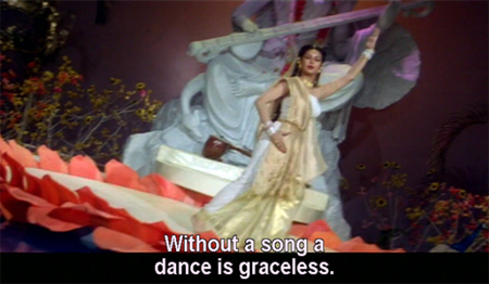 She is very upset to hear this, and tells Arjun about it all. He is stunned to realize that Lata did not kill his sister, but Sita did. He tells Lata that he will take her home, and she asks him if he is not going to kill her after all. She has remembered that he pushed her off the cliff, but because (*stupidity climax here*) he is her husband she is willing to let him kill her if he wants to, although she wants to know why first. I bash my head against the arms of my chair but sadly remain conscious and the film rolls on. He tells her who he is, proclaims his love and she is justly rewarded for her sterling womanly qualities.