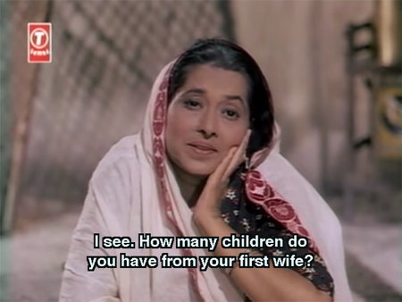 She will not be manipulated by her son and sends Darbari away in disgust. All the women in this film are strong, which I love: Shyama wields the power in her home, Rekha and her mother in theirs. The men on the other hand are all basically ciphers (except Ranjeet in his limited time onscreen), even the bad ones. I think this is a result of the casting rather than any intent on the filmmaker’s part, but it’s interesting.