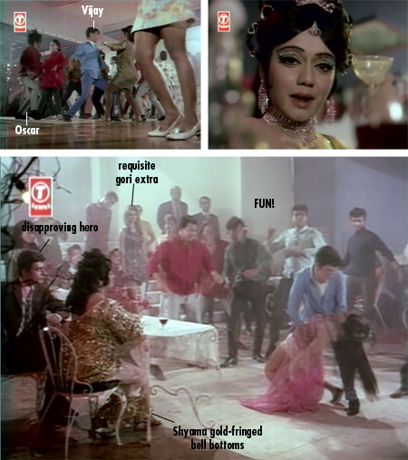 I digress. We are now treated to a fantabulous party song and dance, with choreographers Vijay-Oscar and Chinoo front and center gyrating with Jayshree T. And DO NOT miss Shyama’s fabulous wriggle at the end—and check out her gold-fringed bellbottoms too! (I had linked to a video but it’s already gone; do look the song up if you can find it!)