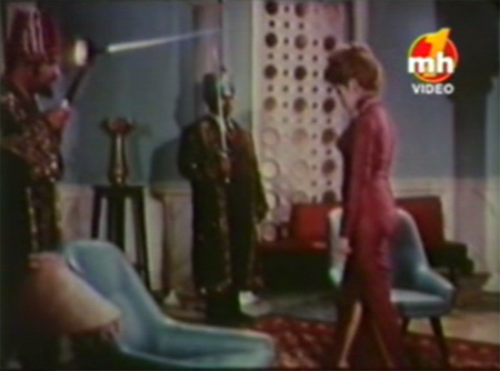 And a guy in a levitating fez tries to lure Kamini away later with a hypnotic blowtorch! Love. All of these (and more!) loony developments are accompanied by background music pilfered from Bond films and other sixties-a-go-go soundtracks.