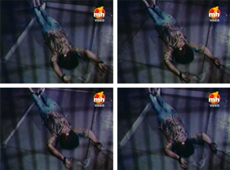 Chang’s most nefarious device is saved for the unfortunate Kamini. I wish I had the skills to extract a short bit of video and put it somewhere, but hopefully these screencaps will suffice: she is tied over a cut-out square in the floor that bumps up and down, up and down, gently but unevenly (as my sister—who has joined me by now—points out, it looks like two guys are probably standing underneath who can’t *quite* coordinate their up-and-down pushing). It is sublimely Python-esque and makes us howl.