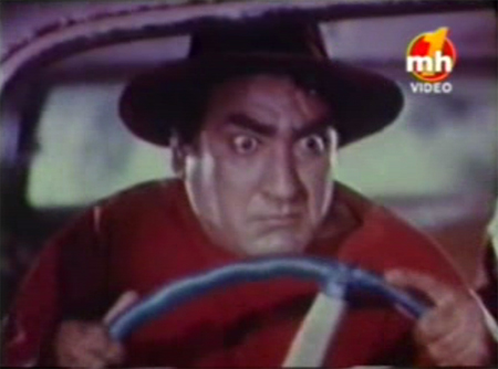 This film surprised me a bit with its violence: women and men alike are roughly manhandled throughout, and the hero is as guilty of it as the villains. He is Rajesh, Agent XX7 (Dev Kumar). Dev Kumar bizarrely (to me) started his career as a hero in various B-movies (the other I’ve seen like this is Ek Khiladi Bawan Pattey, which made even less sense than this, maybe because of the lack of subtitles and maybe not). He is so obviously more suited to villain roles, in which he did later specialize: there is something so exoskeletal about him, all bone and hard planes. I’ve said this before here, but I can only ever think of Ted Cassidy—Lurch—from the Addams Family when I look at him.