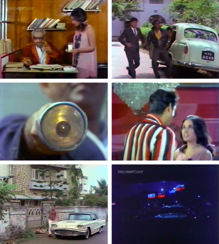This is how it goes: the professor’s daughter Renu (Sapna)—dressed in a little pink nightie—brings him a glass of milk. She admonishes him not to stay up too late and they bid each other a cheerful “good night!”. Outside, villains draw up in their car and are signalled by a man with a torch whose light can barely be seen in the glare of the sun. They break in and kidnap Das. Rakesh arrives too late and runs into Renu who, awakened by the scuffle, mistakes him for one of the villains. Pushing her to the floor, he takes off in hot pursuit of the actual villains (stepping over the poor unconscious watchman who is left abandoned at the gate). As he drives it is suddenly dark out, then light again, then dark, and so on until it seems that they have all been driving for a week.