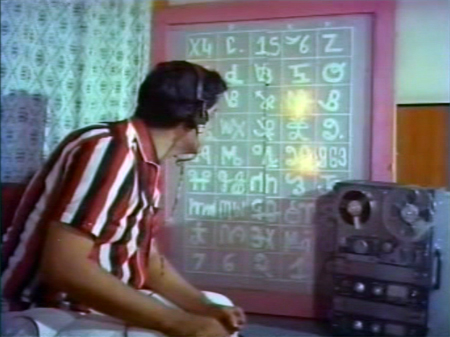I never do figure out what he is called, but it’s my (no doubt inaccurate) impression that someone calls him Red and since it’s as good a name as any I will too. He naturally calls his various henchpeople by number and now instructs Number Char, Raghu (Rajan Haksar), to bring Professor Das and his sound wave machine formoola to him.