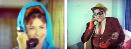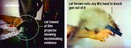 This brings me to the cast—oh Bhagwan, the cast. Along with Helen and Faryal it includes yesteryear lovelies Nigar Sultana and Paro, Joy Mukherjee, Abhi Bhattacharya, Farida Jalal, Bipin Gupta in a double role, IS Johar and a host of heavies (Hercules, Samson, Mohammedali, Rajan Haksar, Samson, and on and on). The henchman acting credits took up two full screens! Plus, a squirming yowling Siamese cat is periodically slung into scenes in an attempt I think to show it as some sort of Superkitty (except that sometimes you can see the arm of the spot boy tasked with chucking it into the frame). Here are but two examples: