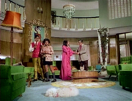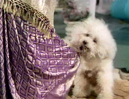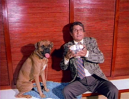 As it happens, Shankar and the poodle are right to be sad: in short order, Sonia tries to murder Shankar by pushing him off the roof (he is in the way of course, as the next in line to Teja’s fortune). Teja doesn’t believe his little brother when he hears of this, and as the poodle comes to Shankar’s defense Laxmidas shoots it dead. If I weren’t already invested in seeing Laxmidas and Sonia pay for their sins, I am now!