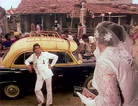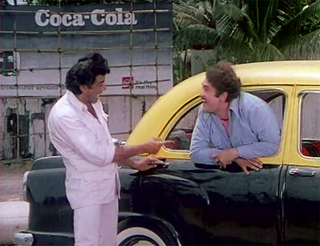 r Saw this movie last night and enjoyed it after a long time. managed to get a copy of the DVD which did not have sub titles. The best scene is your first screen cap ie the taxi scene. Randhir sings a song from one of his dad’s movies “Mera Naam Joker – aaey bhai jaara dekh ke chalo – look were you are going. Dharam asks Randhir “O Raj kapoor’s son – are you from Jumri talaya or naya jalna as u r so fond of singing! The joke in the scene is the obvious reference to Randhir being Raj Kapoor’s son and also the fact that during the days of Radio’s popularity in India in the 70s (before TV became widespread) there were repeated requests for hindi film songs from these villages in India!