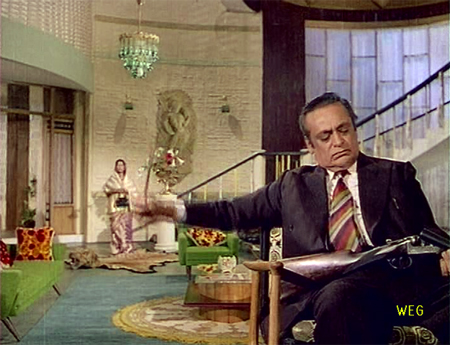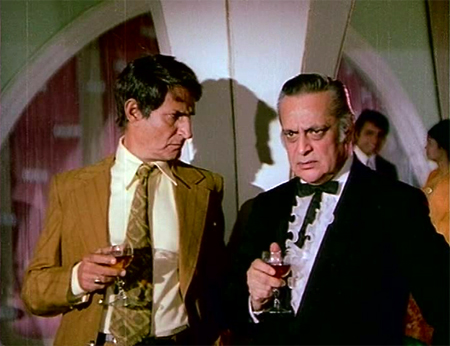 Pinky is enchanted by her savior and invites him to a party. Also attending: Teja and Sonia, whose “son” it turns out, is Kiran. Teja and Kiran clearly have a somewhat strained relationship (Kiran hilariously snarls at him for a cigarette), but Teja hits it off immediately with Sunder and offers him a job. I know I am in the minority on this, but I have a cushy corner in my dil for Randhir. He has great chemistry in this with both Dharmendra and Rehman (and Yogita, for that matter; not in a dashing hero kind of way, but that isn’t required here).