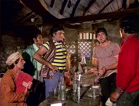He finds work to support himself and sweet Mrs. D’Souza selling movie tickets in black, and grows up to become Dharmendra (=hooray!). His partner in crime is the always-drunk Keshto (Keshto Mukherjee) and the two of them frequent a local bar owned by the feisty Mala (Hema Malini=ooh! pret-ty). Mala and Shankar love each other, in a combative kind of way.